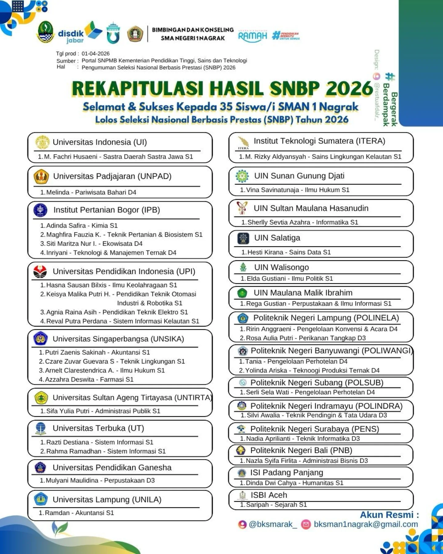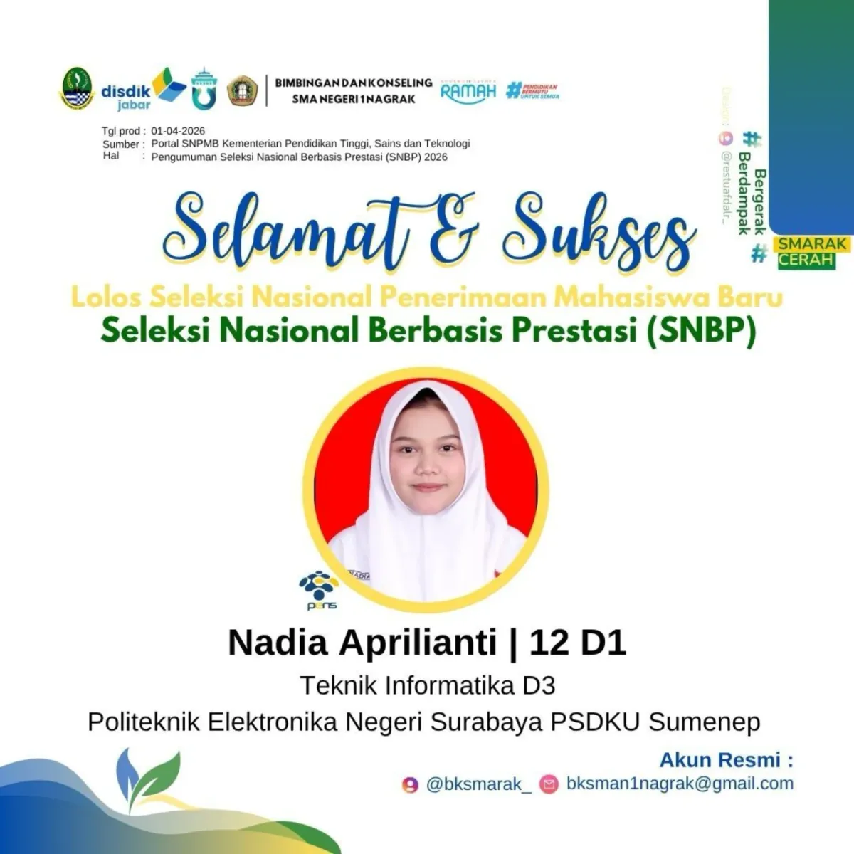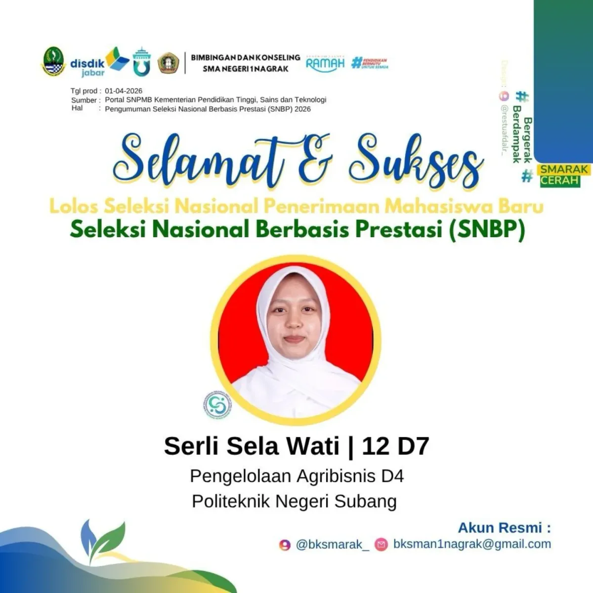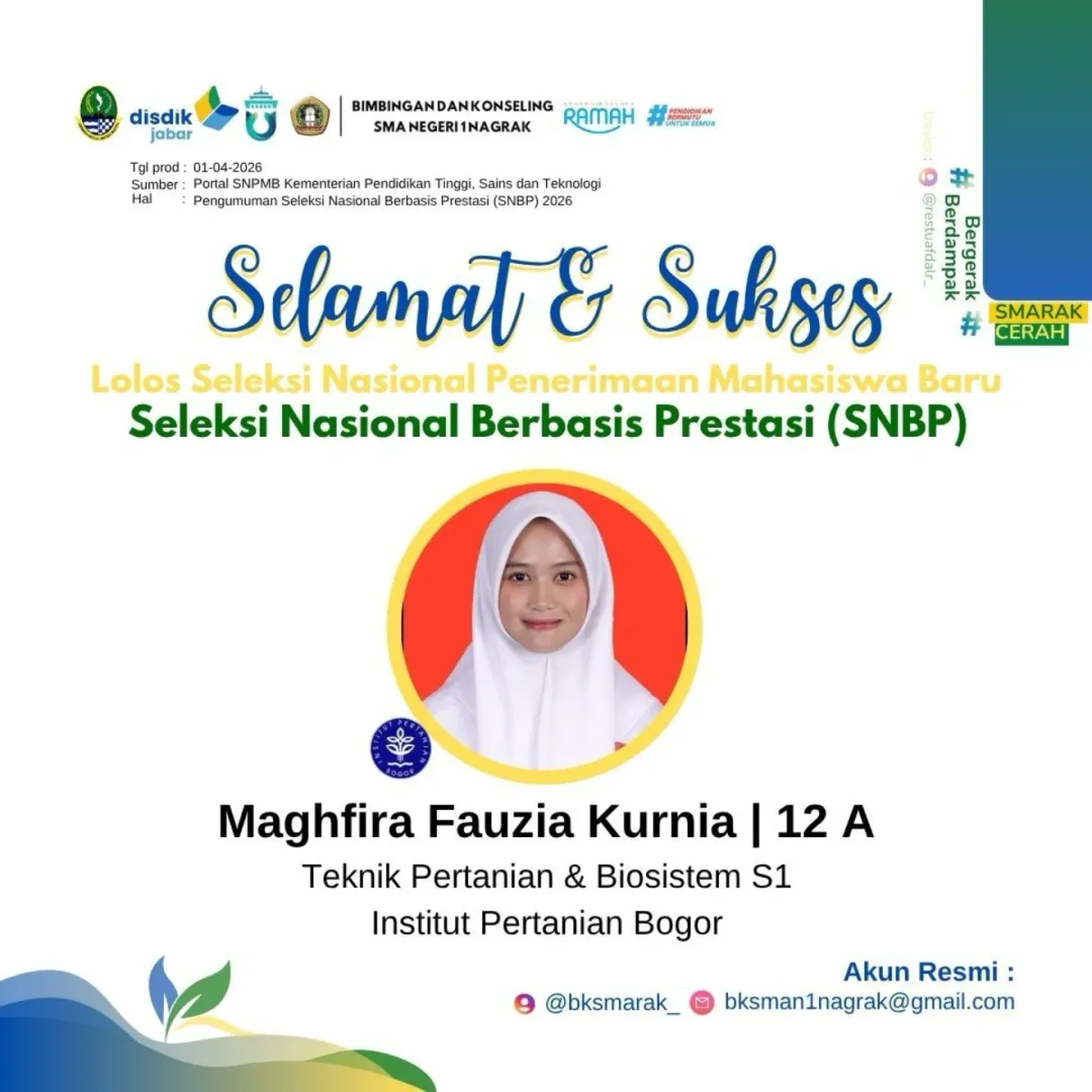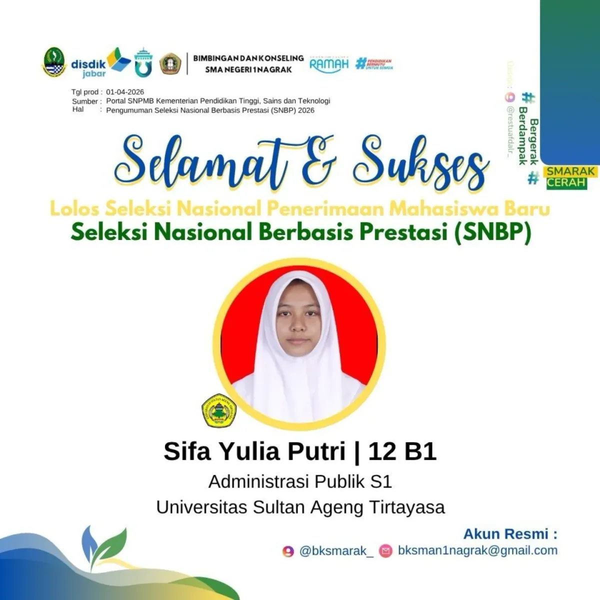 Selamat & sukses kepada 35 siswa/i SMAN 1 Nagrak telah berhasil lolos Seleksi Nasional Berbasis Prestasi (SNBP) tahun 2026. Hasil ini adalah awal dari perjuangan, petualangan dan kemajuan diri untuk membangun hidup lebih baik. Manfaatkan kesempatan berkuliah di kampus impian, raih cita-cita dan jadilah mahasiswa aktif yang senantiasa untuk berkontribusi bagi pendidikan & pengajaran, penelitian, pengabdian pada masyarakat.