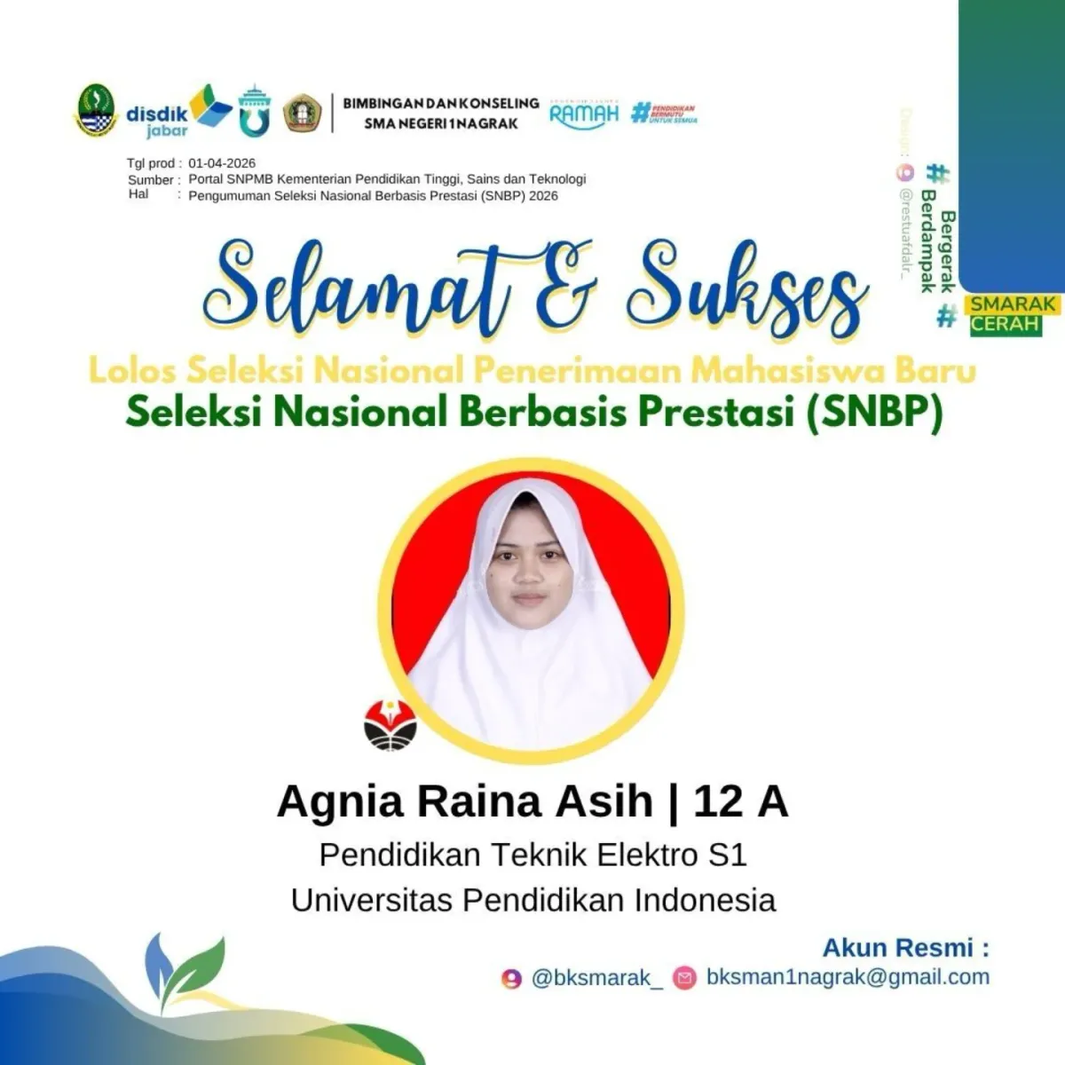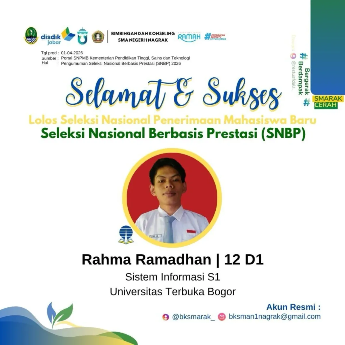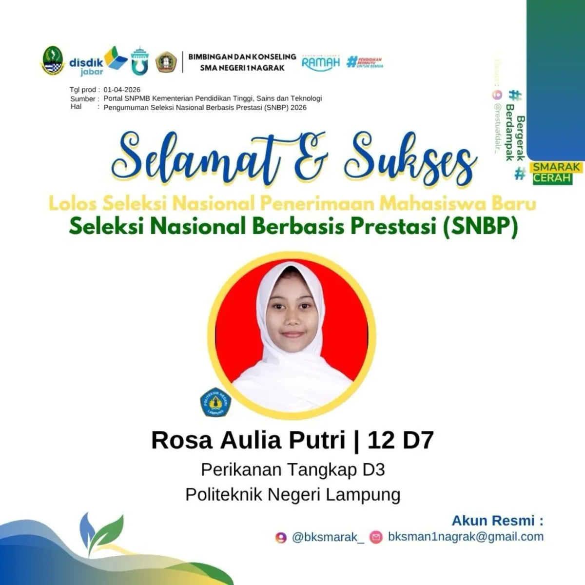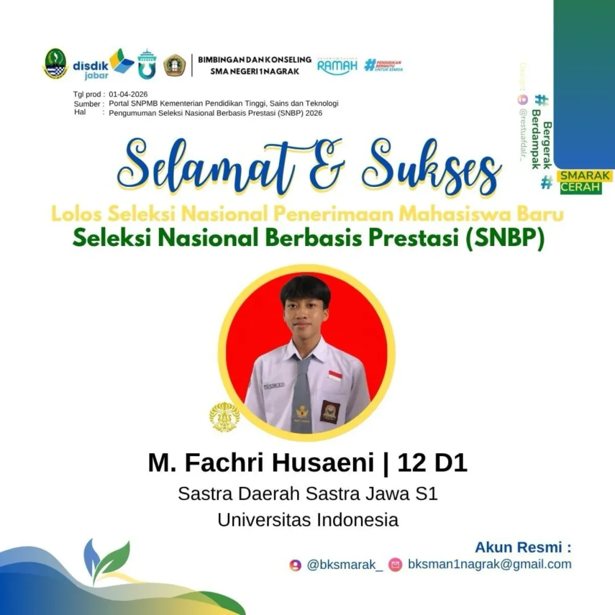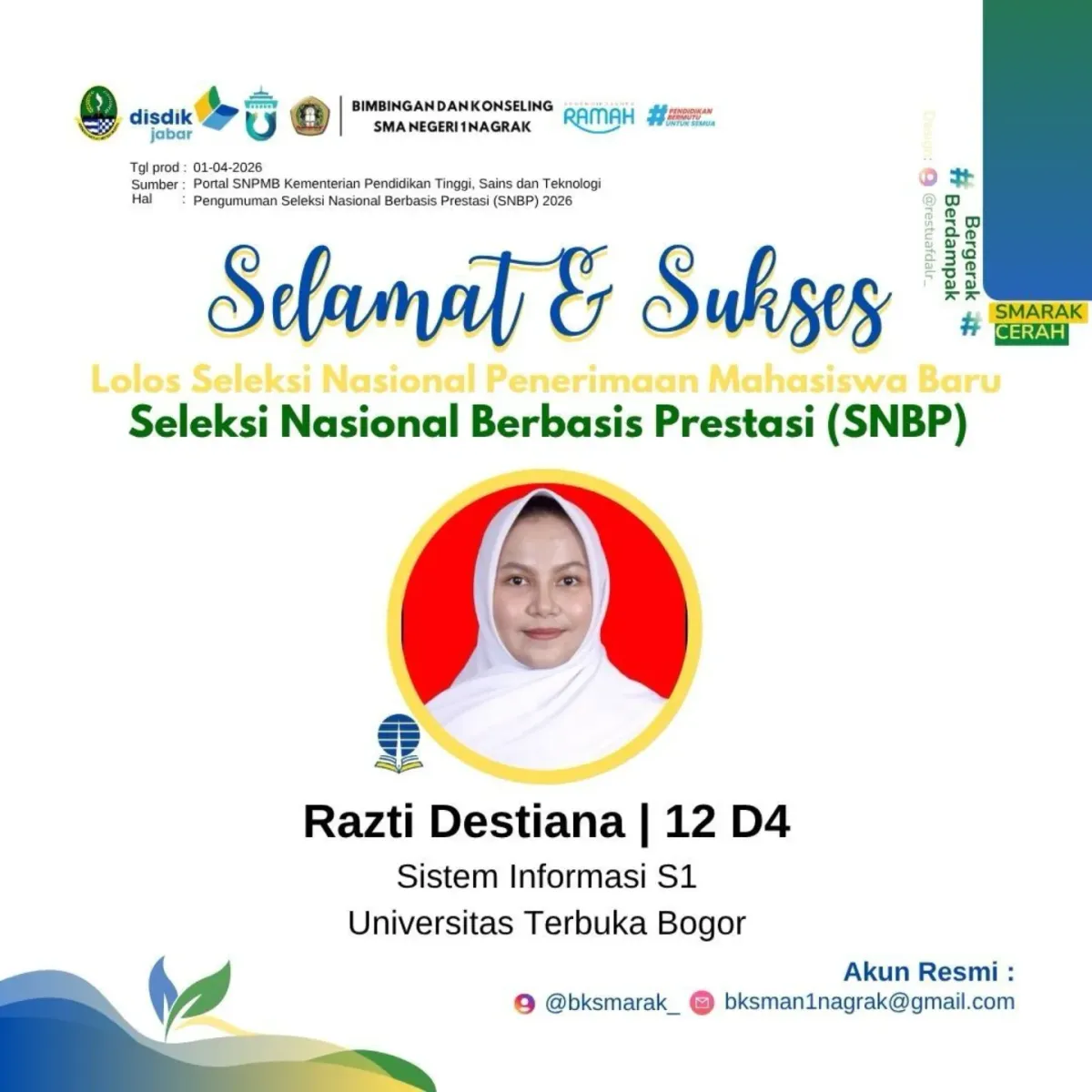 Selamat & sukses kepada 35 siswa/i SMAN 1 Nagrak telah berhasil lolos Seleksi Nasional Berbasis Prestasi (SNBP) tahun 2026. Hasil ini adalah awal dari perjuangan, petualangan dan kemajuan diri untuk membangun hidup lebih baik. Manfaatkan kesempatan berkuliah di kampus impian, raih cita-cita dan jadilah mahasiswa aktif yang senantiasa untuk berkontribusi bagi pendidikan & pengajaran, penelitian, pengabdian pada masyarakat.
