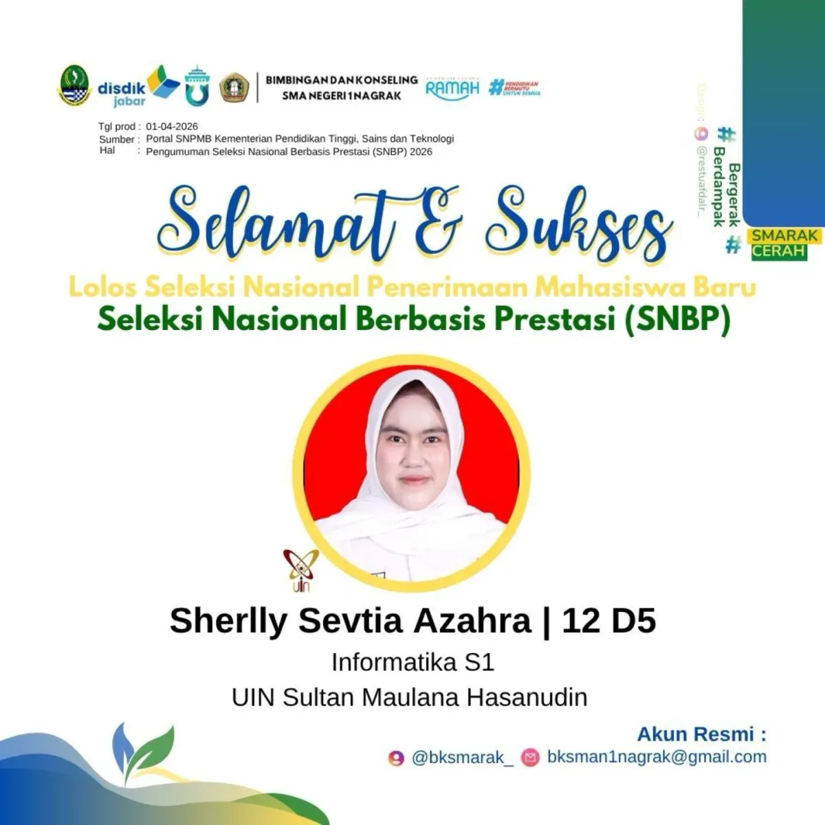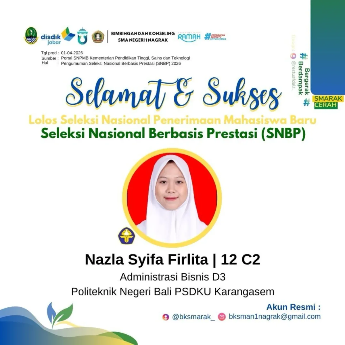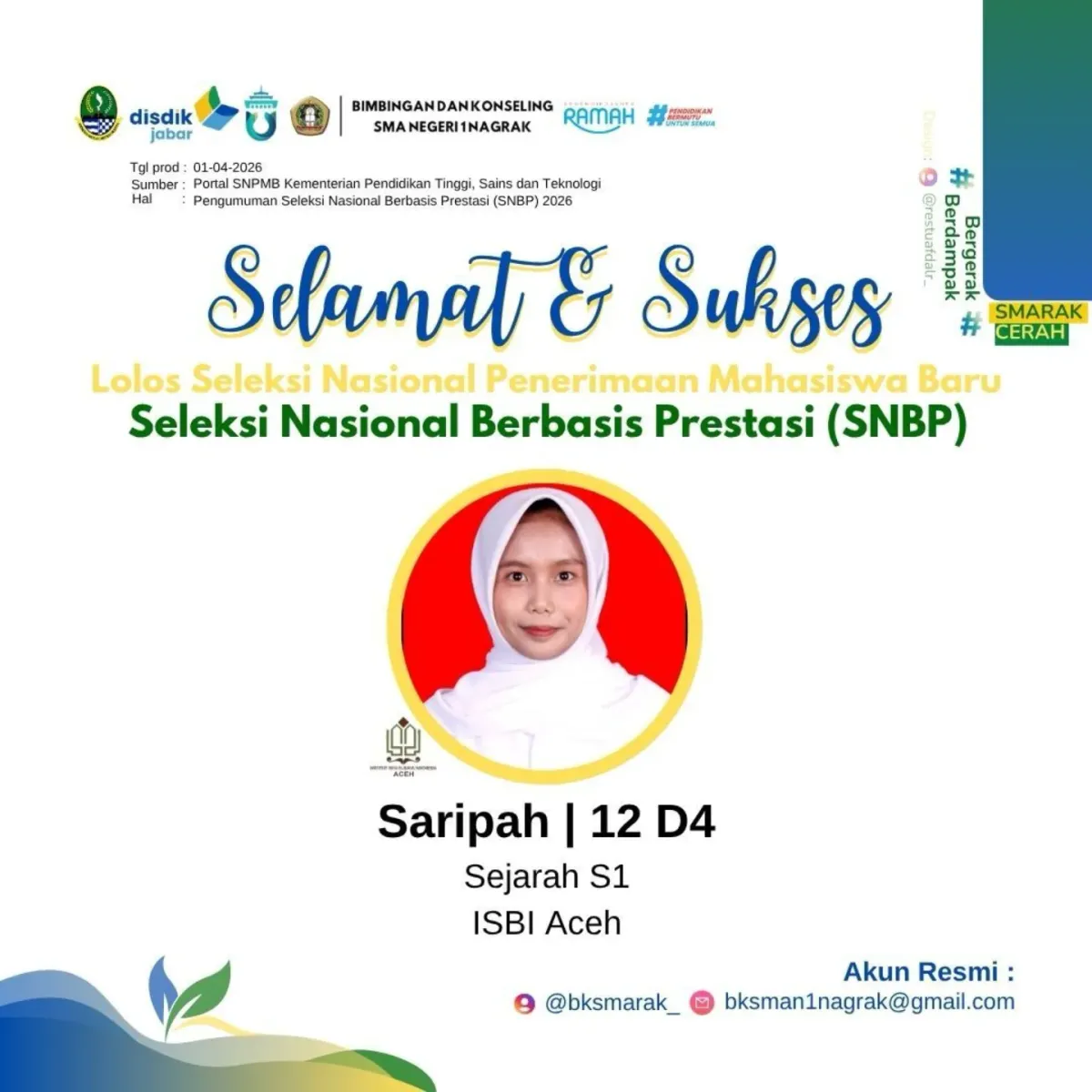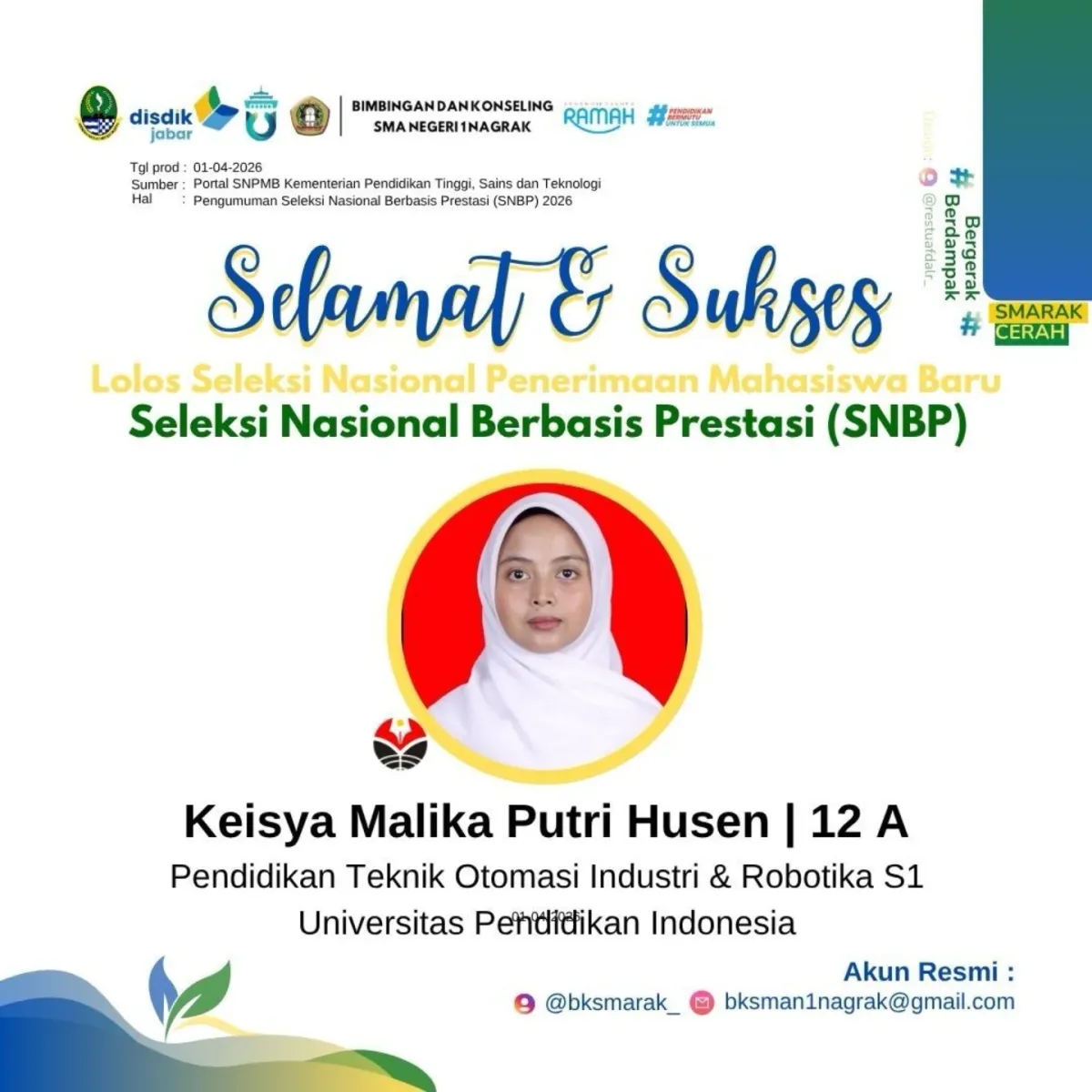 Selamat & sukses kepada 35 siswa/i SMAN 1 Nagrak telah berhasil lolos Seleksi Nasional Berbasis Prestasi (SNBP) tahun 2026. Hasil ini adalah awal dari perjuangan, petualangan dan kemajuan diri untuk membangun hidup lebih baik. Manfaatkan kesempatan berkuliah di kampus impian, raih cita-cita dan jadilah mahasiswa aktif yang senantiasa untuk berkontribusi bagi pendidikan & pengajaran, penelitian, pengabdian pada masyarakat.