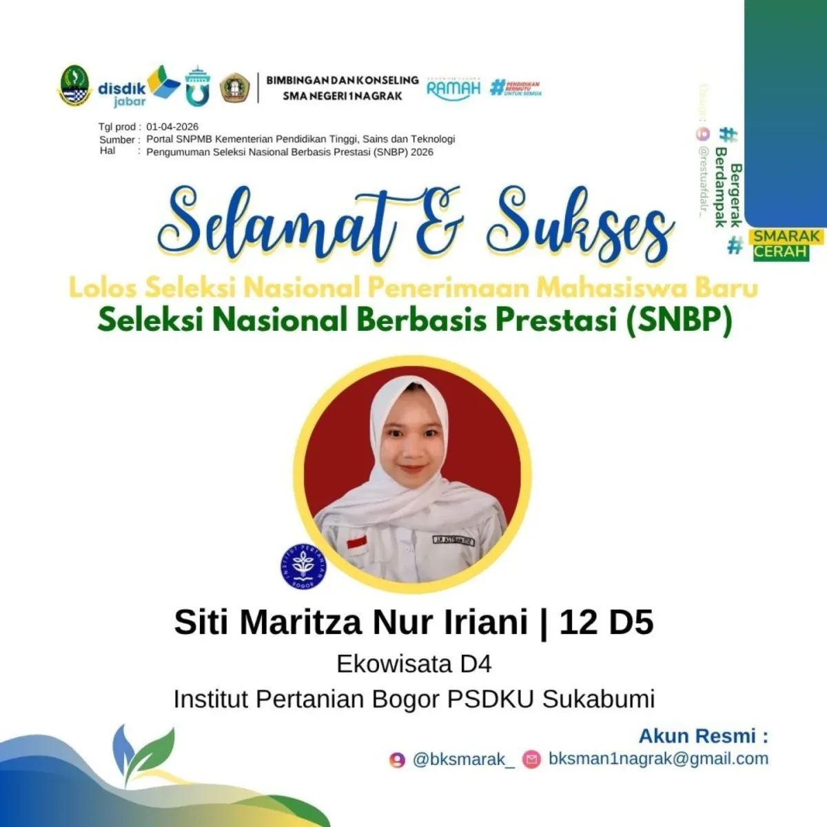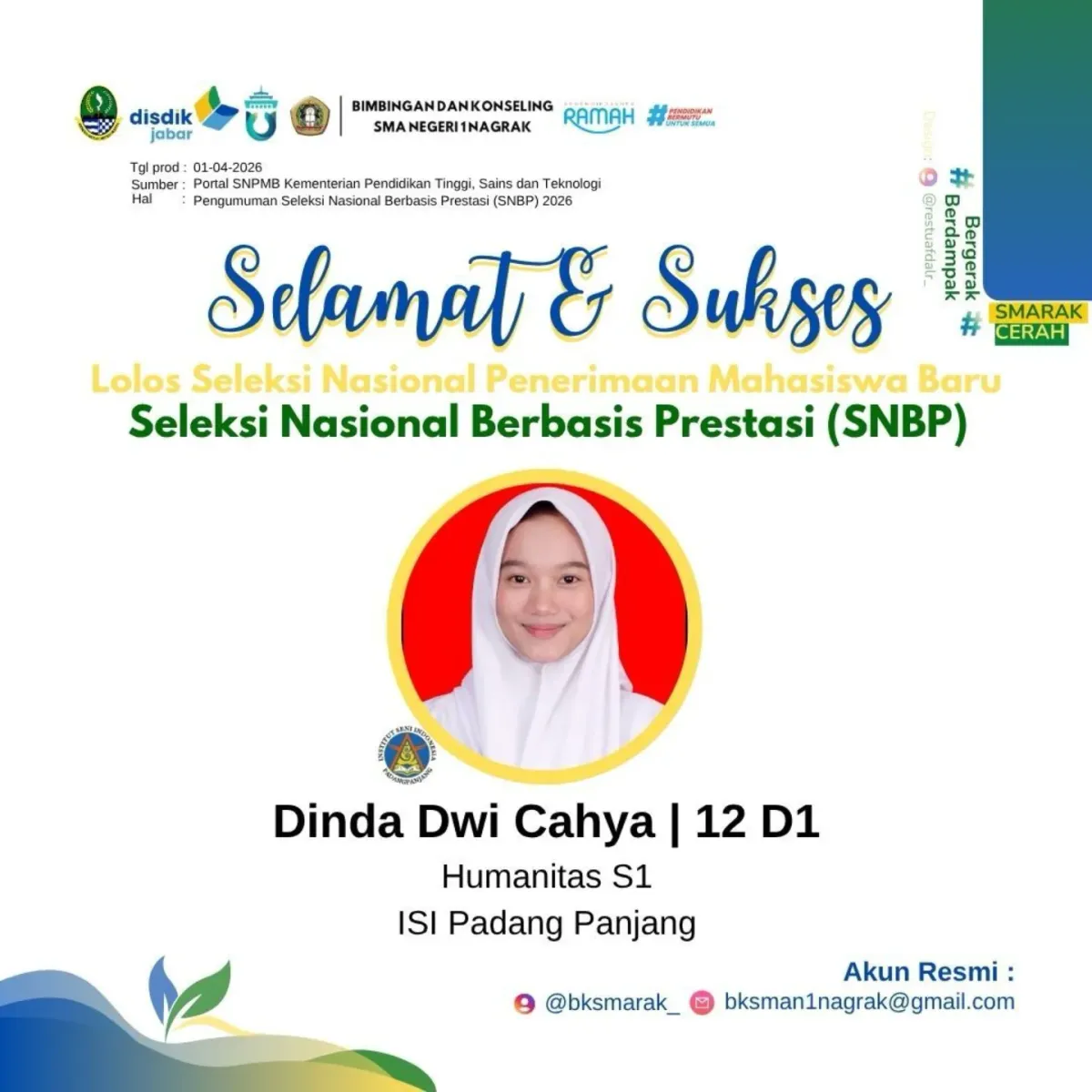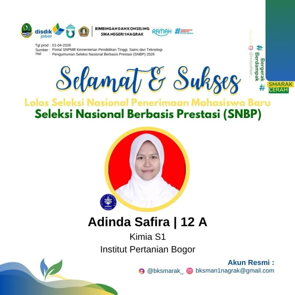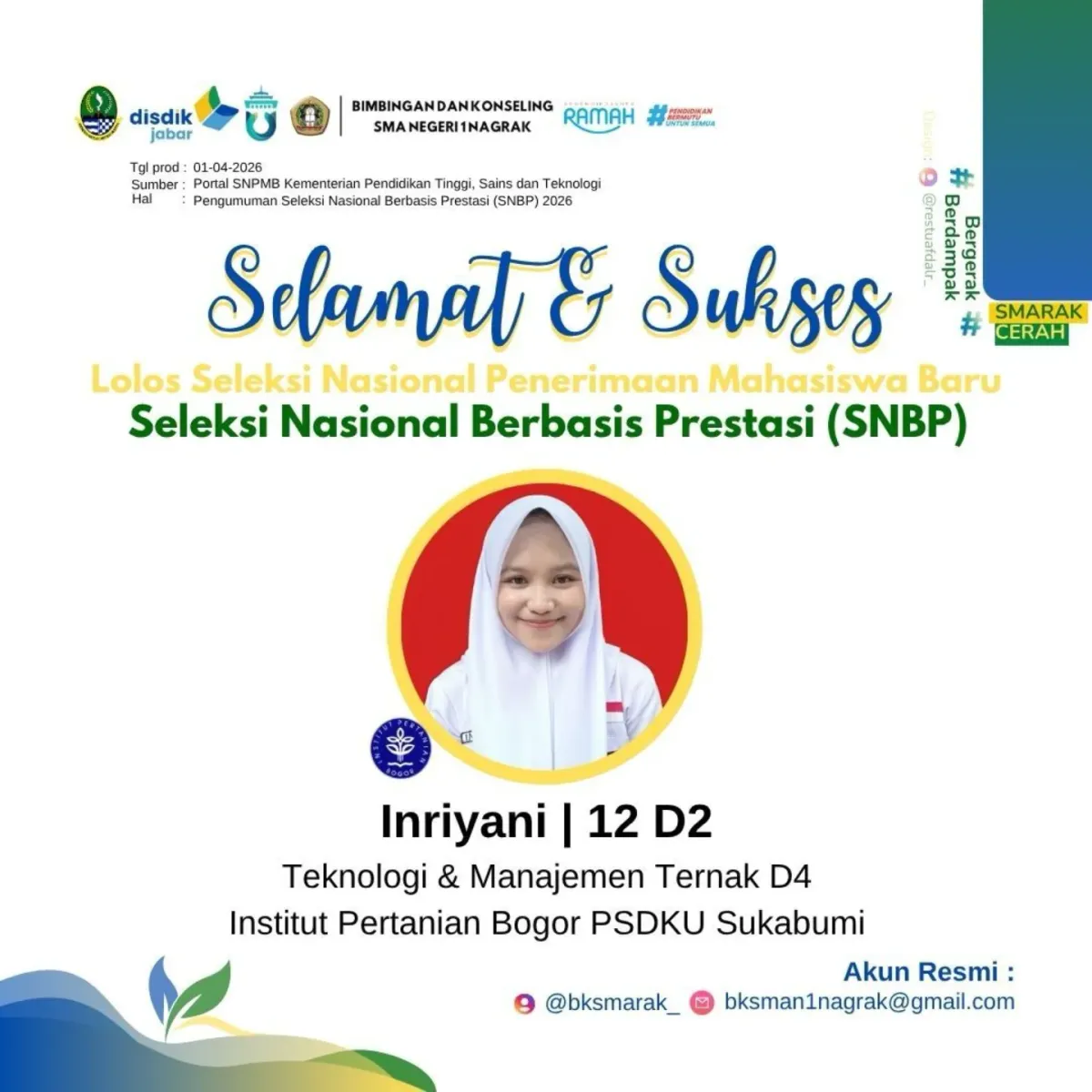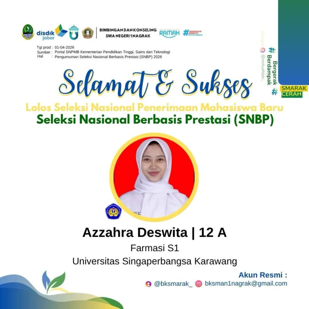Selamat & sukses kepada 35 siswa/i SMAN 1 Nagrak telah berhasil lolos Seleksi Nasional Berbasis Prestasi (SNBP) tahun 2026. Hasil ini adalah awal dari perjuangan, petualangan dan kemajuan diri untuk membangun hidup lebih baik. Manfaatkan kesempatan berkuliah di kampus impian, raih cita-cita dan jadilah mahasiswa aktif yang senantiasa untuk berkontribusi bagi pendidikan & pengajaran, penelitian, pengabdian pada masyarakat.