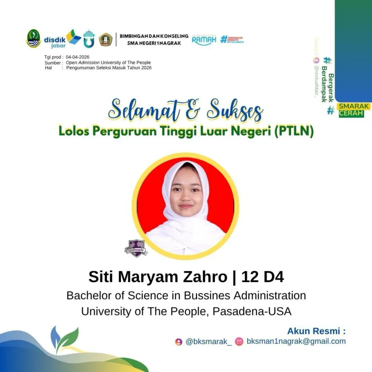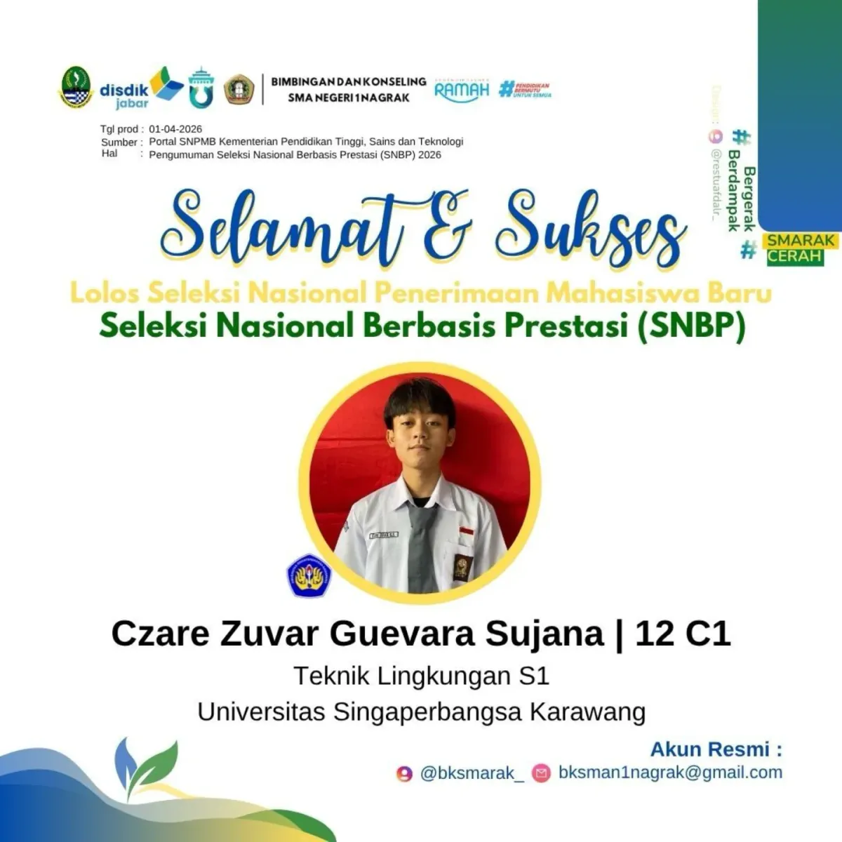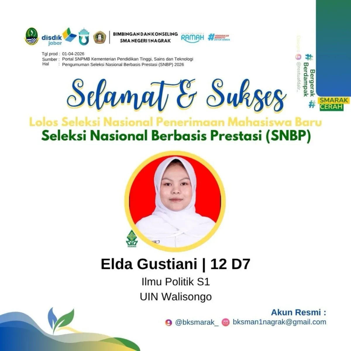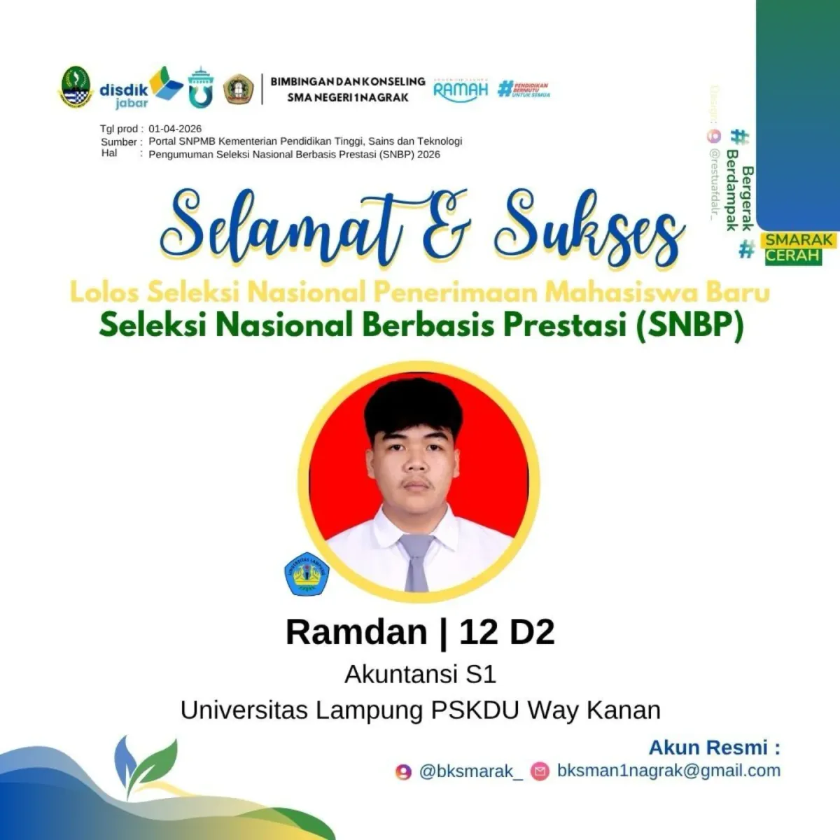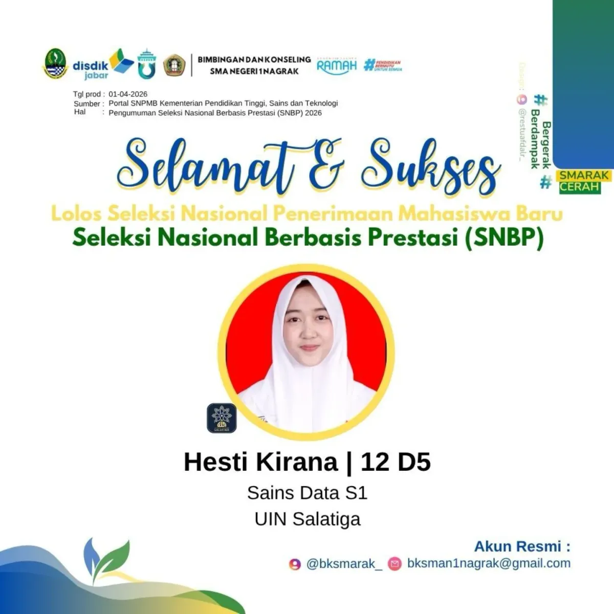 Selamat & sukses kepada 35 siswa/i SMAN 1 Nagrak telah berhasil lolos Seleksi Nasional Berbasis Prestasi (SNBP) tahun 2026. Hasil ini adalah awal dari perjuangan, petualangan dan kemajuan diri untuk membangun hidup lebih baik. Manfaatkan kesempatan berkuliah di kampus impian, raih cita-cita dan jadilah mahasiswa aktif yang senantiasa untuk berkontribusi bagi pendidikan & pengajaran, penelitian, pengabdian pada masyarakat.